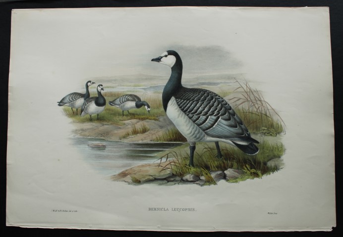 This original lithograph of the Bernicle Goose (Bernicla leucopsis) is from John Gould’s Birds of Great Britain, issued in 25 parts between 1862 and 1873. This plate was drawn and lithographed by Josef Wolf & HC Richter.