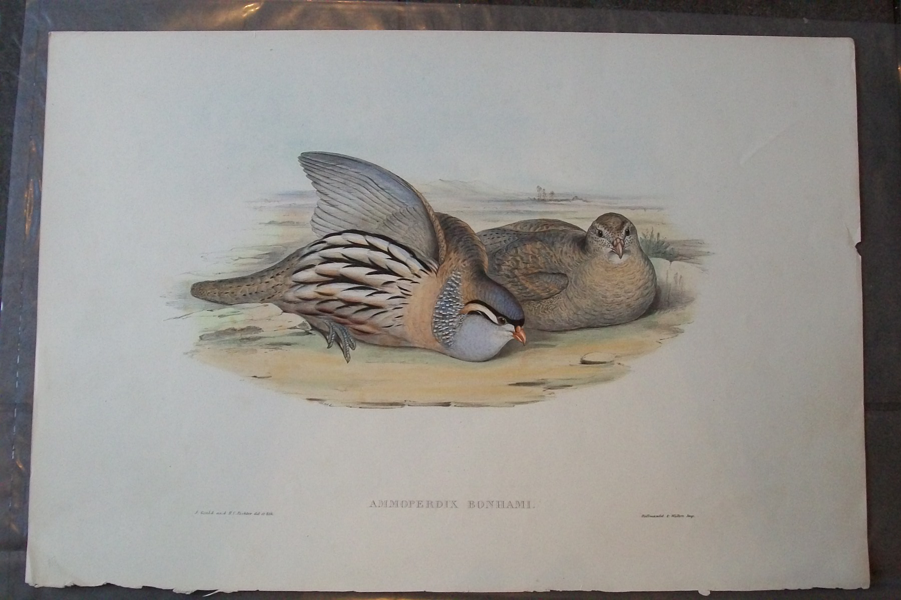 This original lithograph of Bonham’s Sand Partridge or the Asiatic Sand Partridge (Ammoperdix bonhami) is from John Gould’s, Birds of Asia issued in 35 parts between 1849 and 1883, the last three being issued after Gould’s death in 1881 by Bowdler-Sharpe.The print was drawn and lithographed by John Gould and HC Richter.