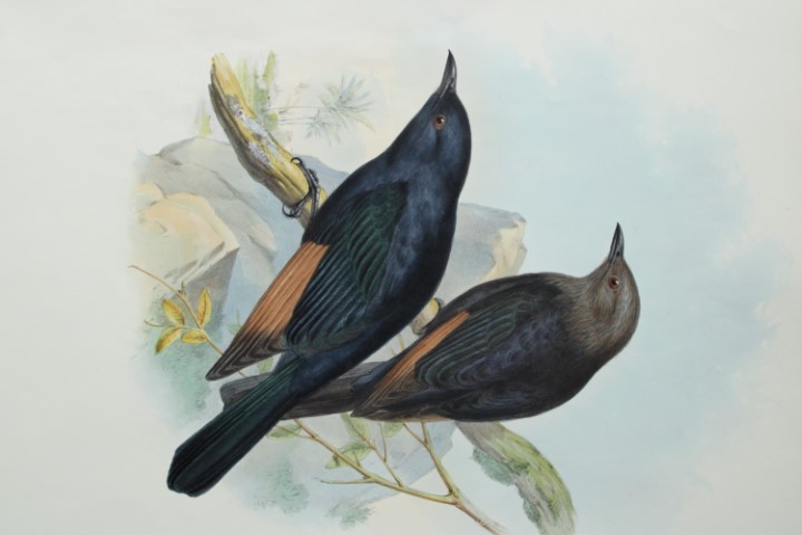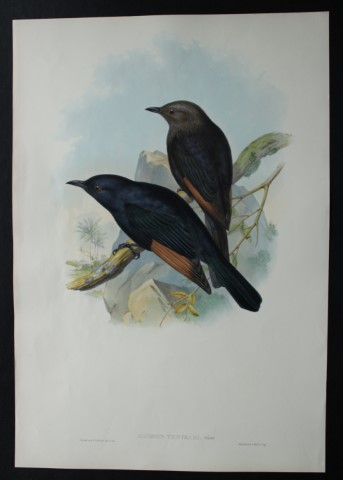 This original lithograph of Tristram’s Amydrus aka Tristram’s Kingfisher (Amydrus tristrami) is from John Gould’s, Birds of Asia issued in 35 parts between 1849 and 1883, the last three being issued after Gould’s death in 1881 by Bowdler-Sharpe.The print was drawn and lithographed by John Gould and HC Richter.