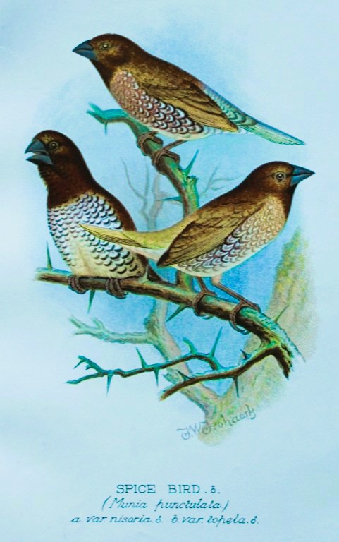 This chromolithographic plate was drawn by Frederick W Frohawk and is from Foreign Finches in Captivity by Arthur G Butler, published by Brumby and Clarke Ltd, 1899.