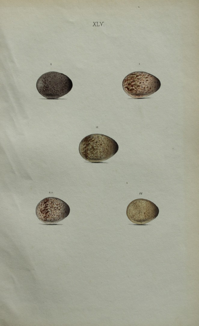 This hand-coloured engraving of bird eggs is from the Coloured Illustrations of the Eggs of British Birds accompanied with descriptions of the Eggs and Nests by William C Hewitson, published by Jan Van Voorst, London, 1856.