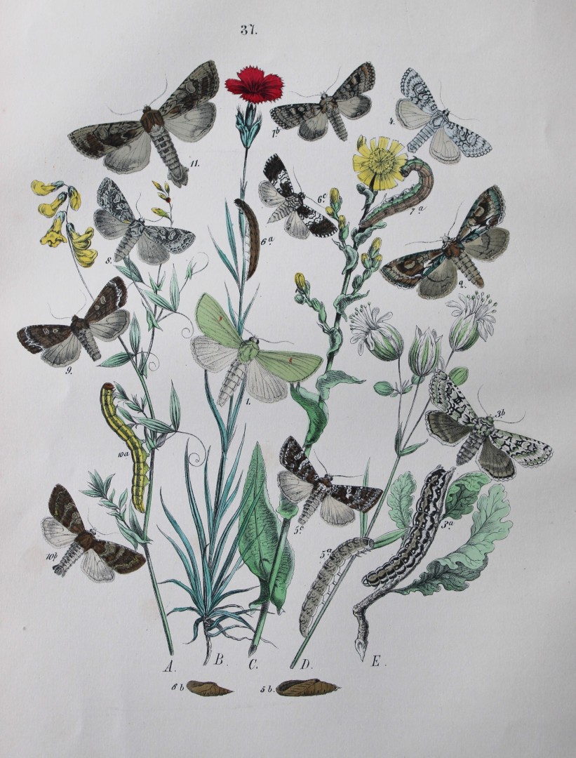 On each plate there are multiple images of up to 15 varieties of butterflies and moths (usually less than 10 though) together with a number of plants listed.