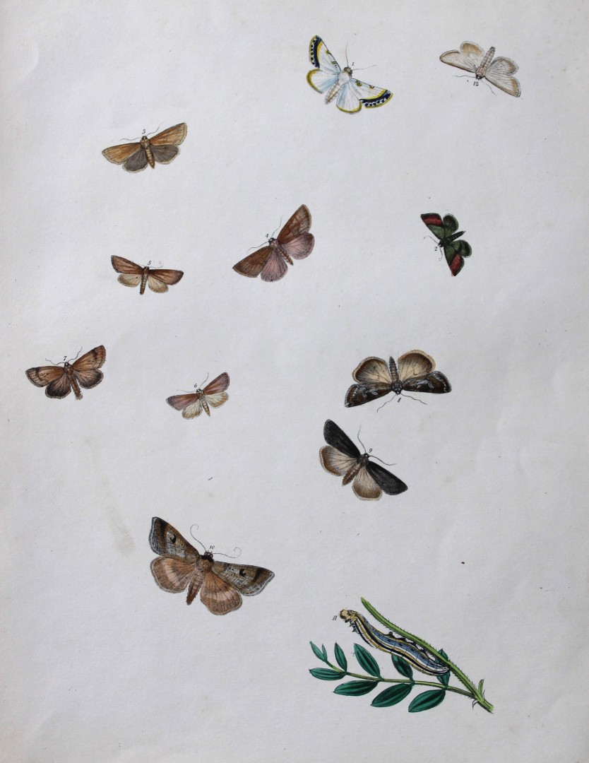 This print illustrates various moth species, including some of their caterpillar and chrysalis, and the flowers and plants they inhabit.