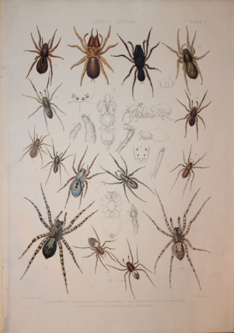 This hand-coloured lithograph is from A History of the Spiders of Great Britain and Ireland by John Blackwall. First edition published for the Ray Society by Robert Hardwicke, Piccadilly London1864.