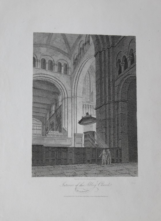 Copper plate engraving of the Interior of the Abbey Church, St Albans by F. Nash and engraved by J Storer. Published by W Dodsworth, London 1814.