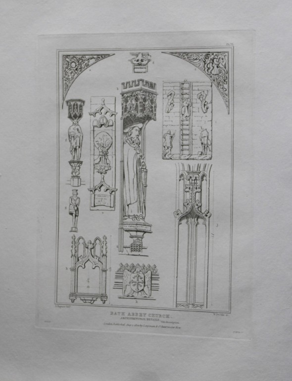 Original engraving of Architectural Details in Bath Abbey Church by S Rayner after W Deeble. Published by Longman & co, London 1824.