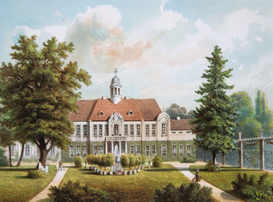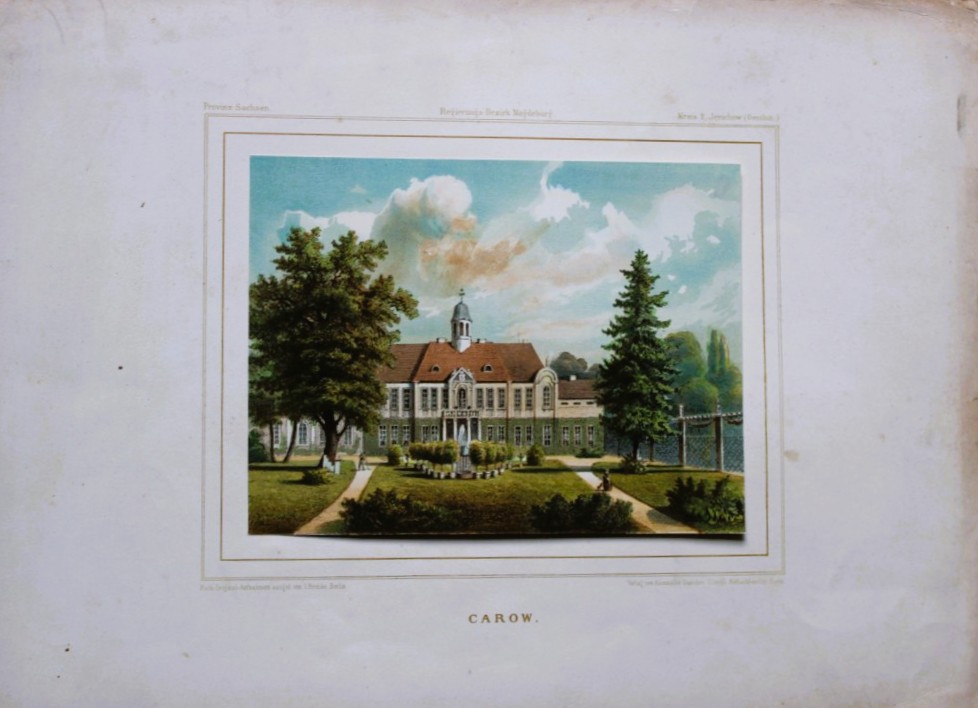 This coloured lithograph of Carow is from Die ländlichen Wohnsitze, Schlösser und Residenzen der Ritterschaftlichen Grundbesitzer in der Preussischen Monarchie by Alexander Duncker Published in Berlin 1857.
