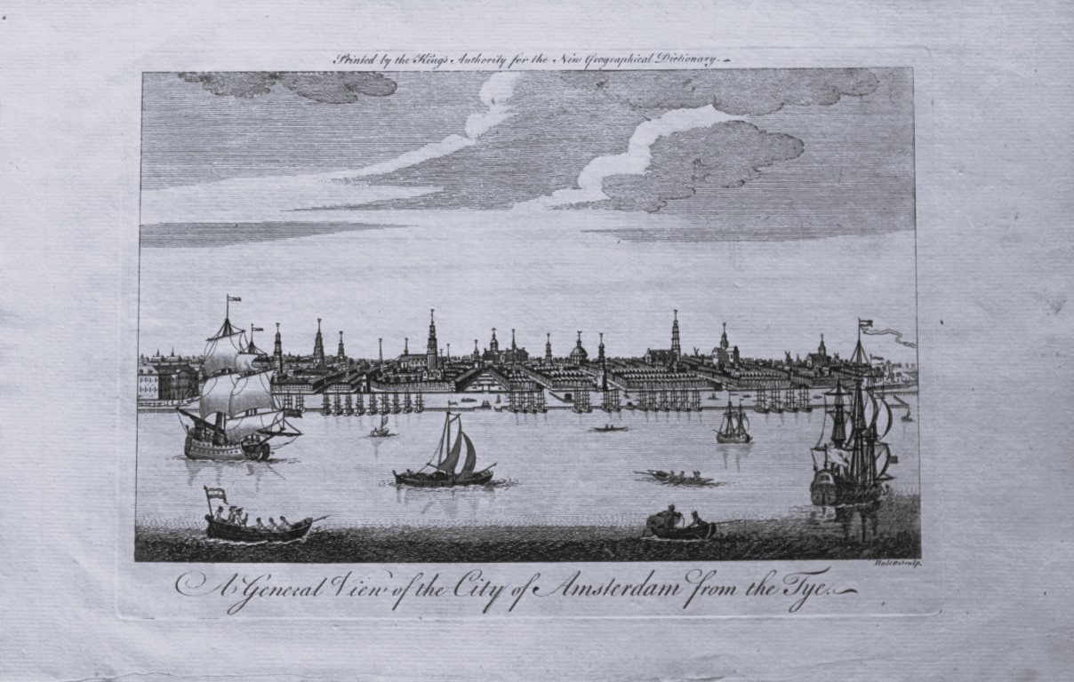 This is an original antique engraving of A General View of the City of Amsterdam from the Tye taken from the New Geographical Dictionary by John Barrow. Engraved by J Hulett and printed by J Coote, London,1760.