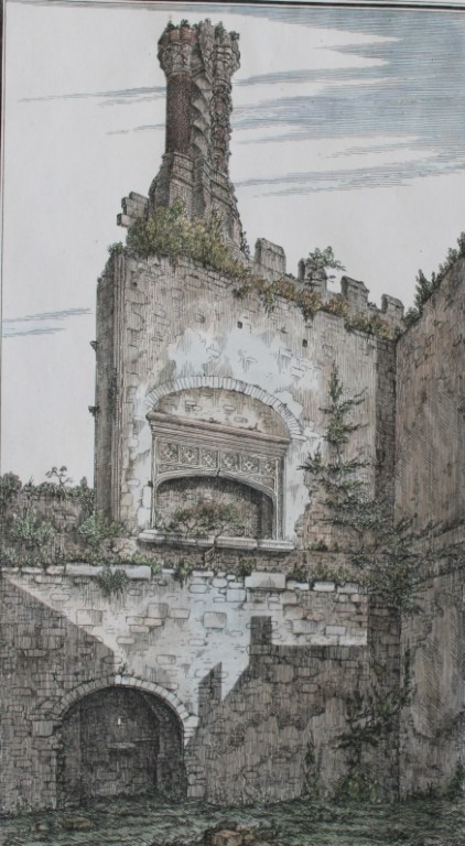 This hand coloured engraving entitled Part of the new building at Thornbury Castle in Gloucestershire is by Samuel Lysons, dated 1802.