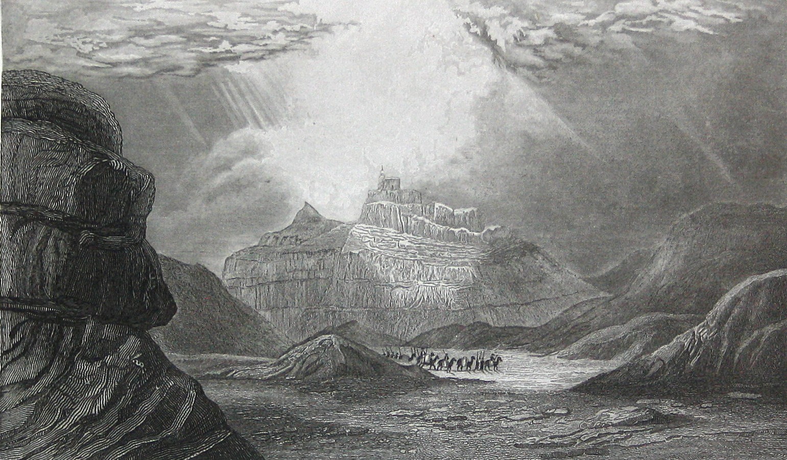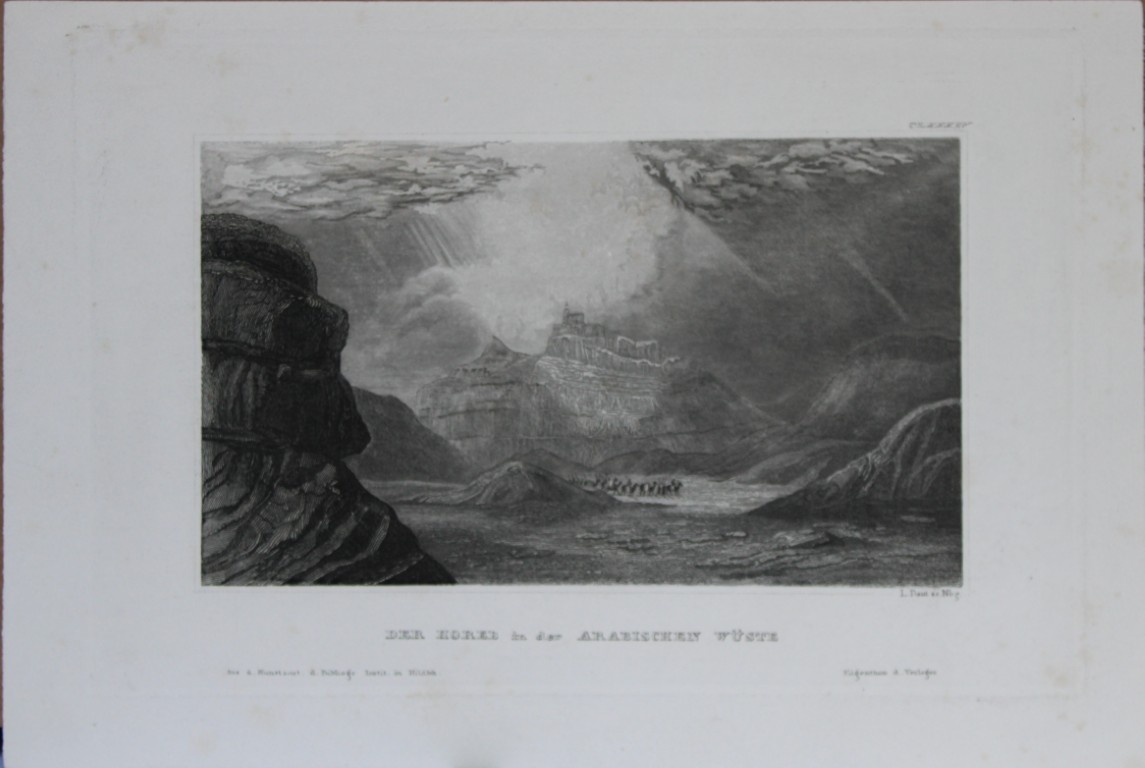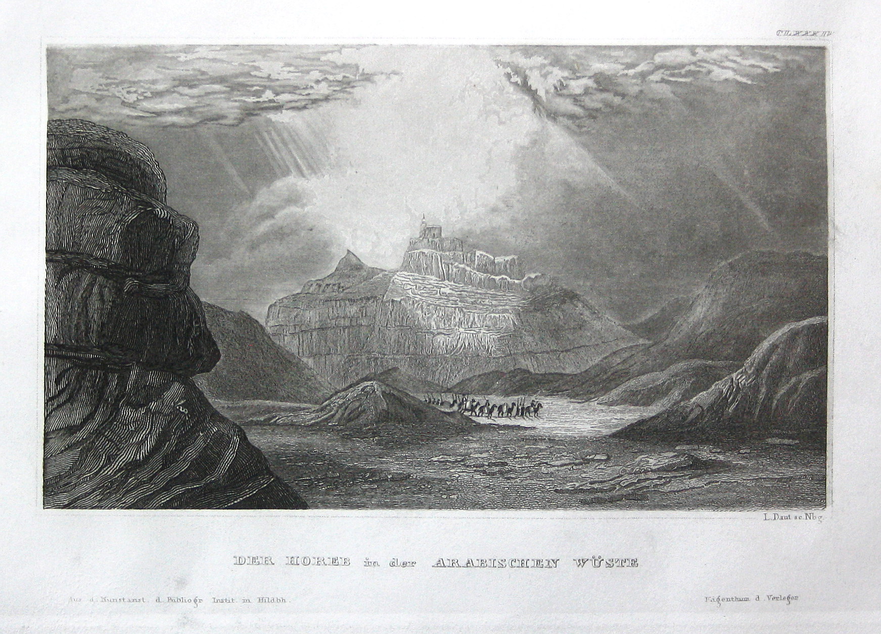 Steel engraving by L Daut entitled Der Horeb in der Arabischen Wuste or The Horeb in the Arabian Desert. Published Hildburghausen, 1837.