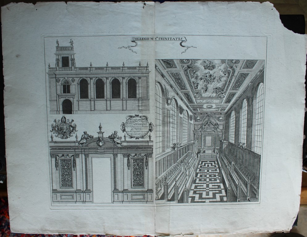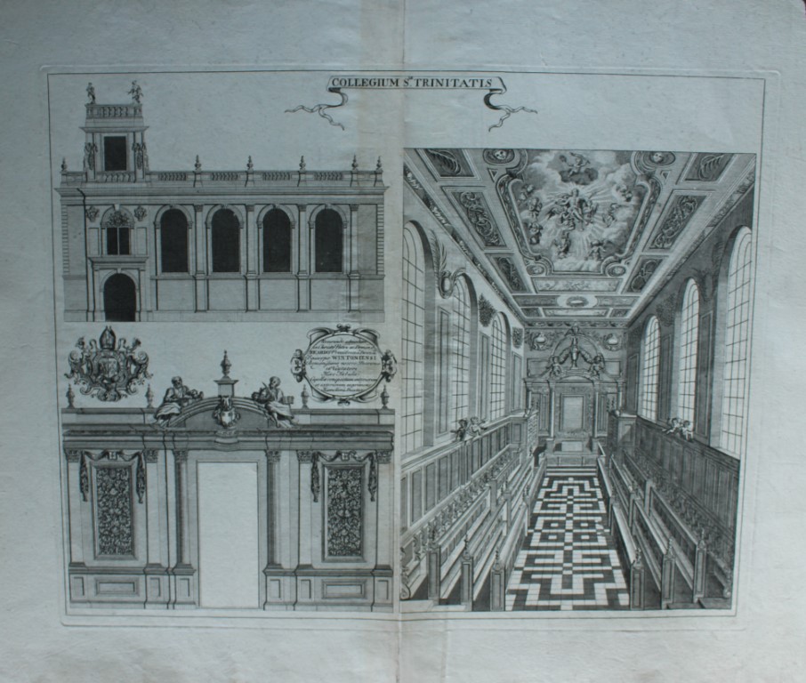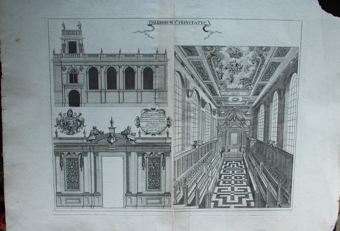 Inscribed ‘Collegium St. Trinitatis’ depicting a facade of the chapel above a drawing of a detail of the entrance portico. On the right a perspective view of the interior of the chapel is shown from clerestory height.