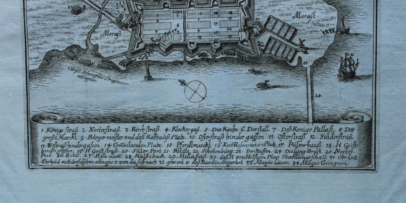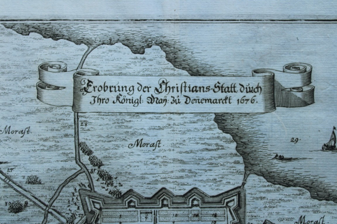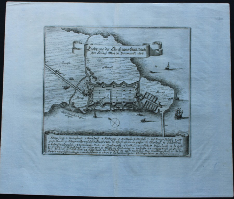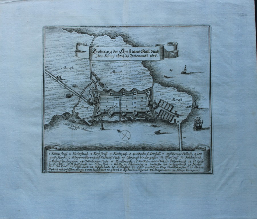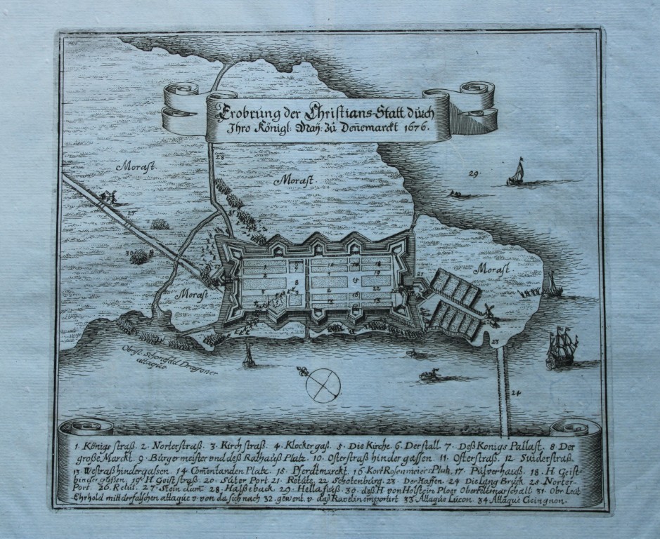 This copper engraving by Matthaus Merian is from Theatrum Europaeum 1682 and is entitled Erobrung der Christians-Statt durch Ihro Königl: May: zu Denemarckt 1676. Grundrissplan der Stadt mit einigen Schiffen und Erklärung