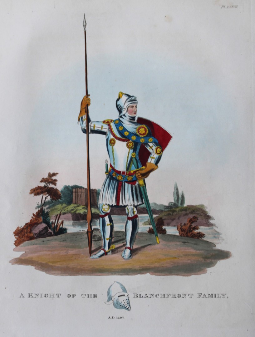This superb hand-coloured engraving of A Knight of the Blanchfront Family is Plate XXXVII from the 1842 enlarged folio edition of A Critical Inquiry into Antient Armour, as it existed in Europe, particularly in Great Britain from the Norman conquest to the Reigns of King Charles II by Sir Samuel Rush Meyrick.