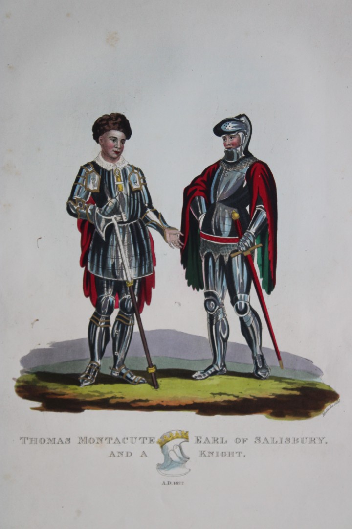 This superb hand-coloured engraving of Thomas Montecute Earl of Salisbury and a Knight is Plate XLI from the 1842 enlarged folio edition of A Critical Inquiry into Antient Armour, as it existed in Europe, particularly in Great Britain from the Norman conquest to the Reigns of King Charles II by Sir Samuel Rush Meyrick.