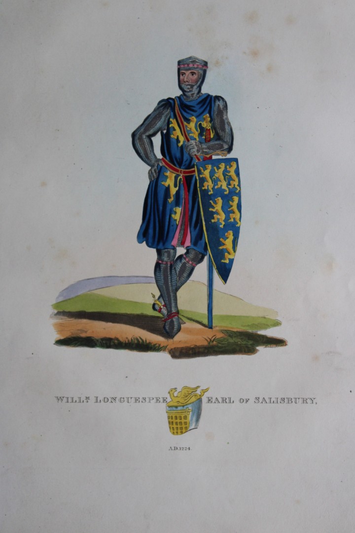 This superb hand-coloured engraving of William Longuespee Earl of Salisbury is Plate XVI from the 1842 enlarged folio edition of A Critical Inquiry into Antient Armour, as it existed in Europe, particularly in Great Britain from the Norman conquest to the Reigns of King Charles II by Sir Samuel Rush Meyrick.