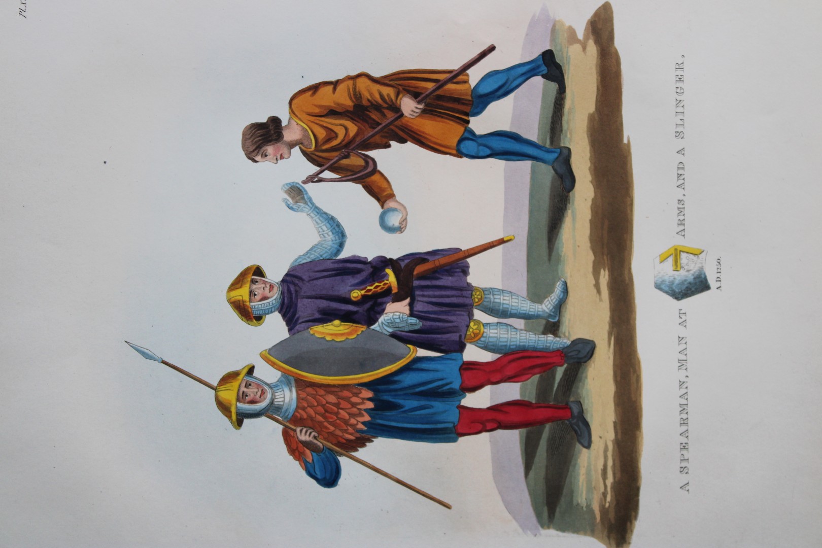 This superb hand-coloured engraving of A Spearman at Arms and a Slinger by Samuel Meyrick 1842 from the 1842 enlarged folio edition of A Critical Inquiry into Antient Armour, as it existed in Europe, particularly in Great Britain from the Norman conquest to the Reigns of King Charles II. This masterpiece established his reputation as the foremost expert on ancient armour and is still used as a reference to this day. The print is beautifully hand-coloured on white Whatman watermarked paper and many of these prints are lavishly illuminated in gold and silver. Each print is accompanied by a copy of the descriptive text.