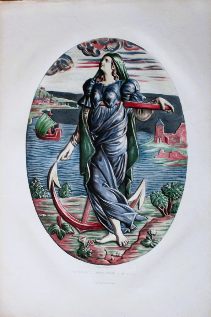 This lithograph is of L’Esperence, appartenant à Mr. Vitel is from Monographie de L’Oeuvre de Bernard Palissy suivie d’un Choix de ses Continuateurs ou Imitateurs by M. Alexandre Sauzay and M. Henri Delange, printed by E Martinet, Paris 1862.