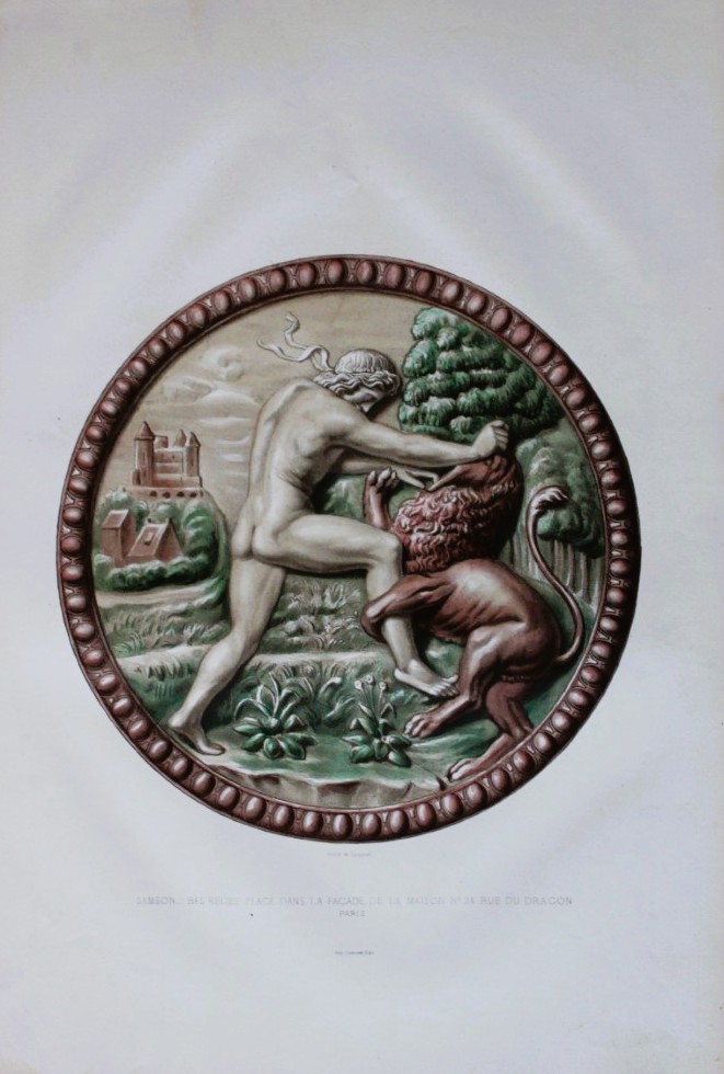 This lithograph is of Samson, bas-relief place dans la façade de la maison no. 24 rue du Dragon, Paris is from Monographie de L’Oeuvre de Bernard Palissy suivie d’un Choix de ses Continuateurs ou Imitateurs by M. Alexandre Sauzay and M. Henri Delange, printed by E Martinet, Paris 1862.