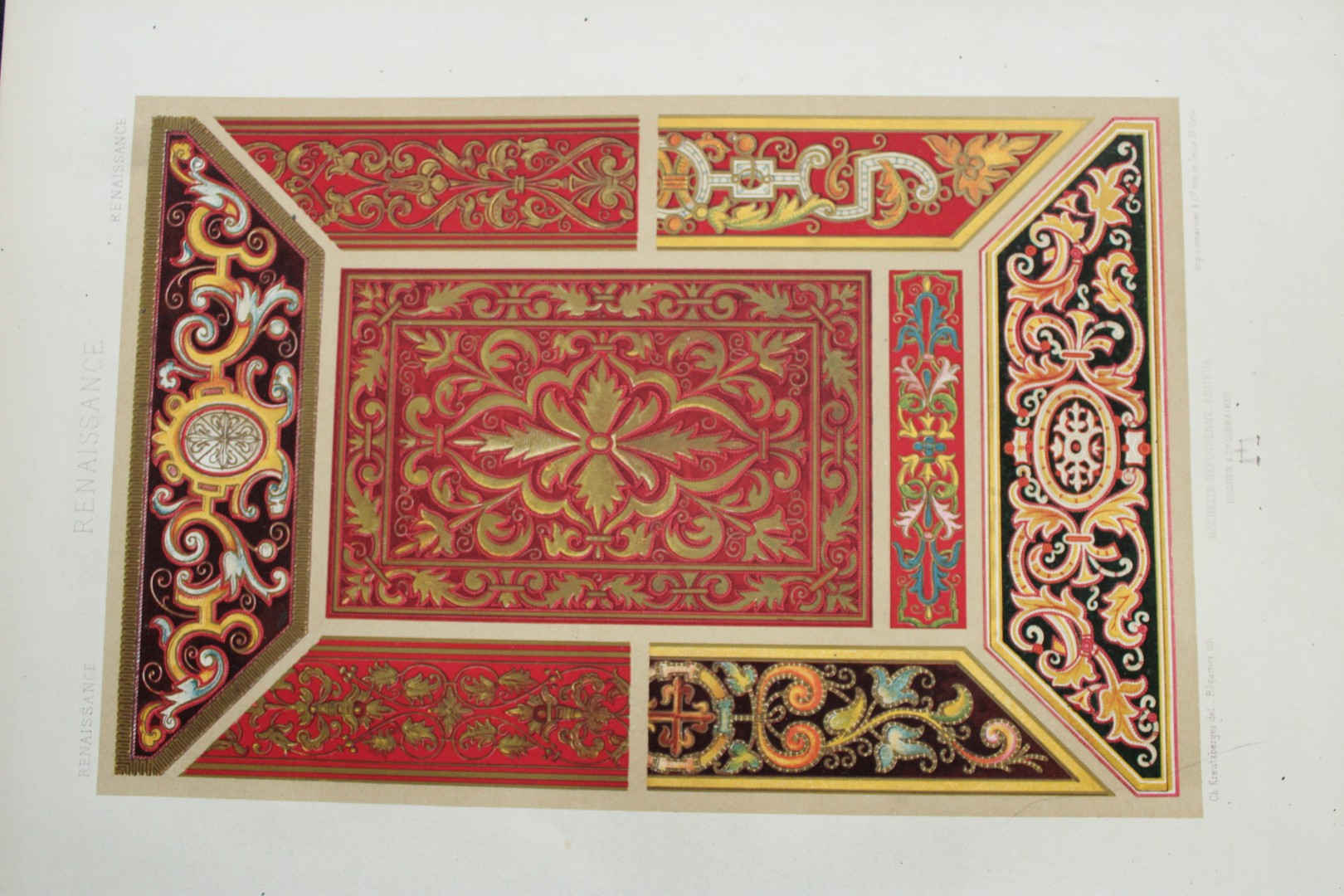 These lithographic prints of decorative designs are from L’Ornement Polychrome cent planches en couleurs…. by Auguste Racinet. Published by Firmin Didot et Cie and printed by Lemercier et Cie., Paris 1873. The lithographer was F. Durin.