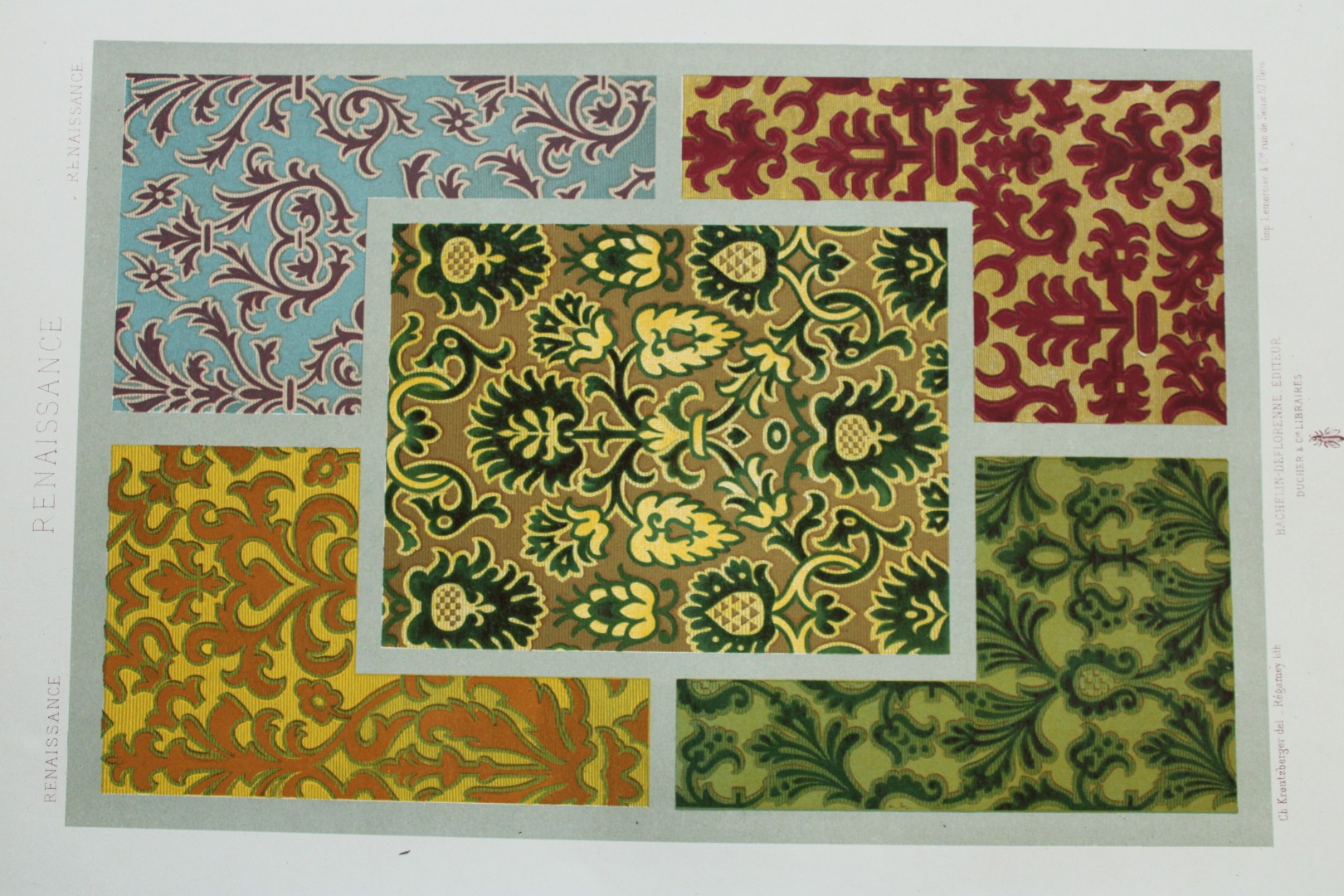This chromolithographic print of decorative art is from Sammlung von Decorationen – Stickereien und Stoffmustern – Aus der Blüthezeit der Renaissance (Collection of Decorations – Embroidery and fabric patterns – From the heyday of the Renaissance) by M. Dupont-Auberville. Published in Stuttgart by Paul Neff 1881.