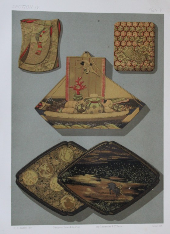 This beautiful chromolithographic print is from The Ornamental Arts of Japan by George Ashdown Audsley. 1st edition, published by Sampson Low, Marston, Searle, & Rivington, London 1882-4,
