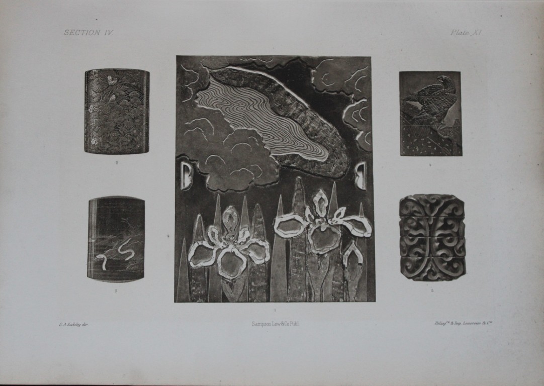 This beautiful chromolithographic print is from The Ornamental Arts of Japan by George Ashdown Audsley. 1st edition, published by Sampson Low, Marston, Searle, & Rivington, London 1882-4,