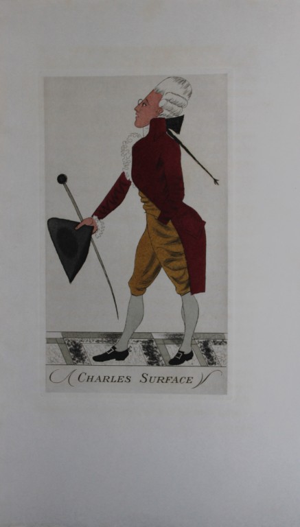 These hand coloured etchings by Rene Ben Sussan are from The School for Scandal – A Comedy by R Sheridan. Published in Oxford and printed for the Members of the Limited Editions Club 1934.