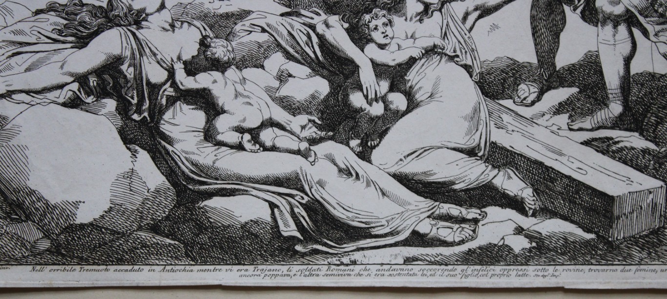 The plate is entitled Nell orrible Tremuoto accaduto in Antiocia mentre vi era Trajano ( In the horrible earthquake that happened in Antioch while Trajan was there).