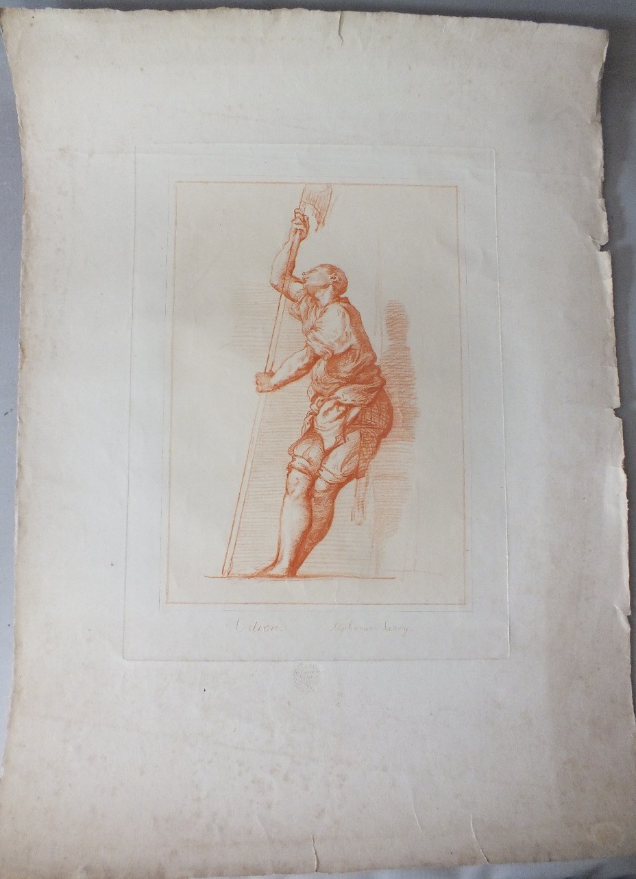 This study of a man with a poleaxe is by Alphonse Leroy after Giulio Campi. Published by Chalcographie du Louvre 1849.