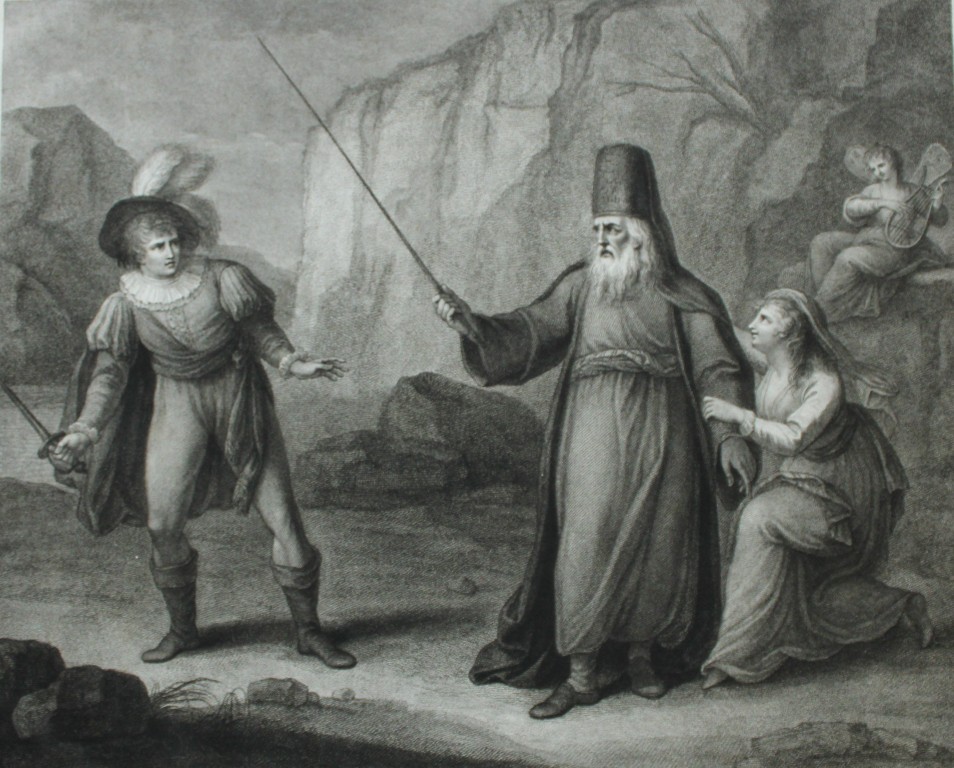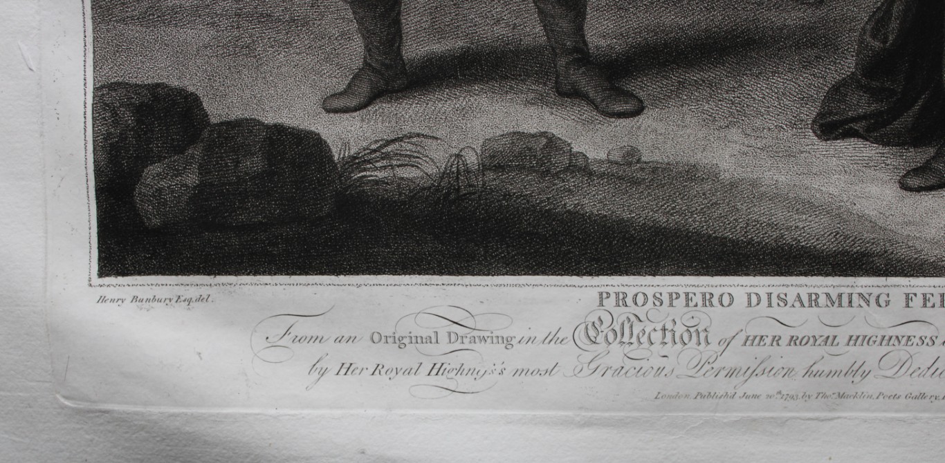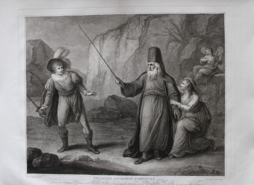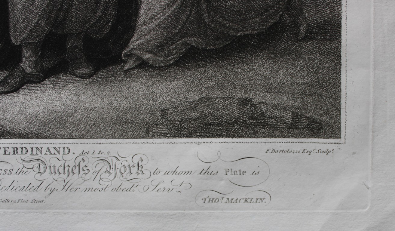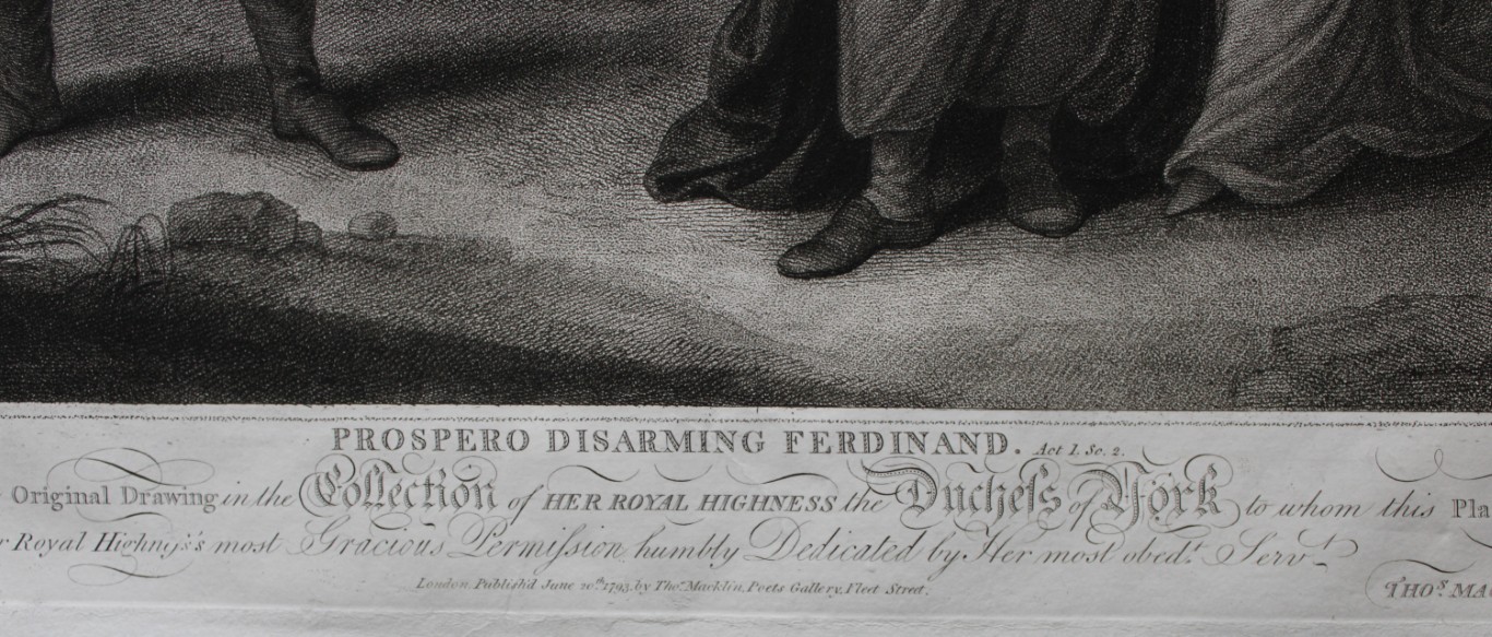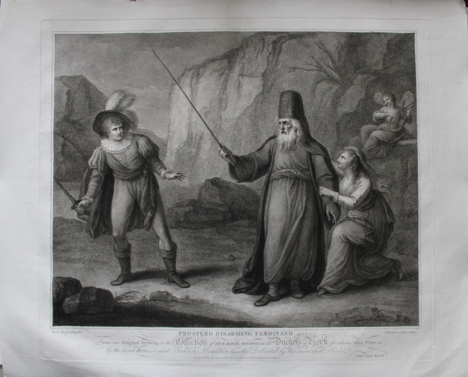 This stipple engraving of Prospero Disarming Ferdinand was published according to Act of Parliament by Thomas Macklin of the Poets Gallery London 1792.