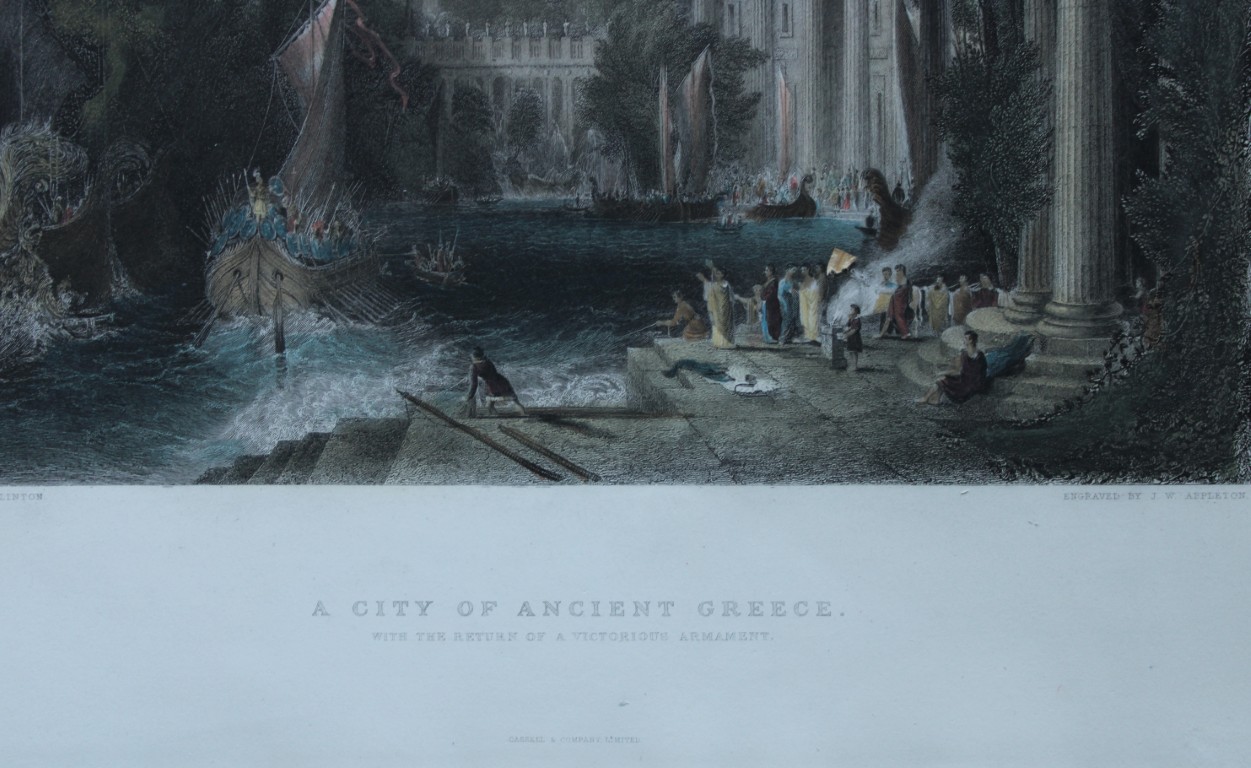 This coloured steel engraving of A City of Ancient Greece. With the return of a victorious armament, engraved by JW Appleton after a painting by William Linton.