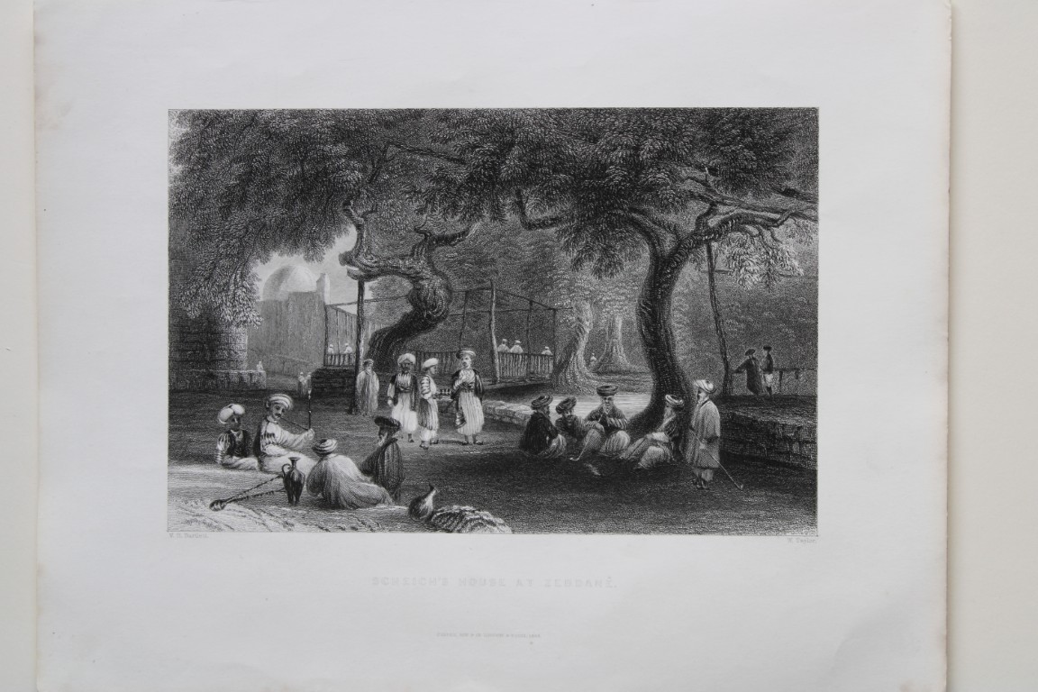 Steel engraving of the Scheich’s House at Zebdane in Syria engraved by W Taylor after William Henry Bartlett. Published by Fisher, Son & Co., London & Paris 1839.