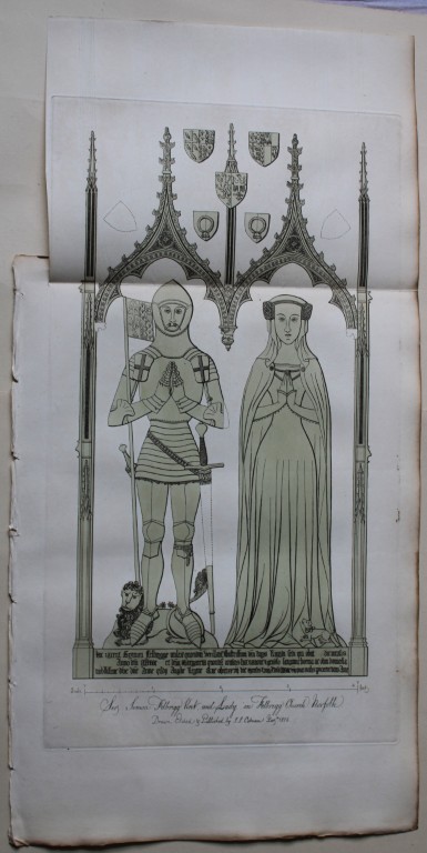 The full title of this work is Engravings of Sepulchral Brasses in Norfolk tending to illustrate the Ecclesiastical, Military and Civil Costume as well as to preserve memorials of Ancient Families in that County. In addition to an introductory essay by Dawson Turner Esq. the notes were prepared by Sir Samuel Rush Meyrick, Albert Way & Sir N Harris Nicolas.