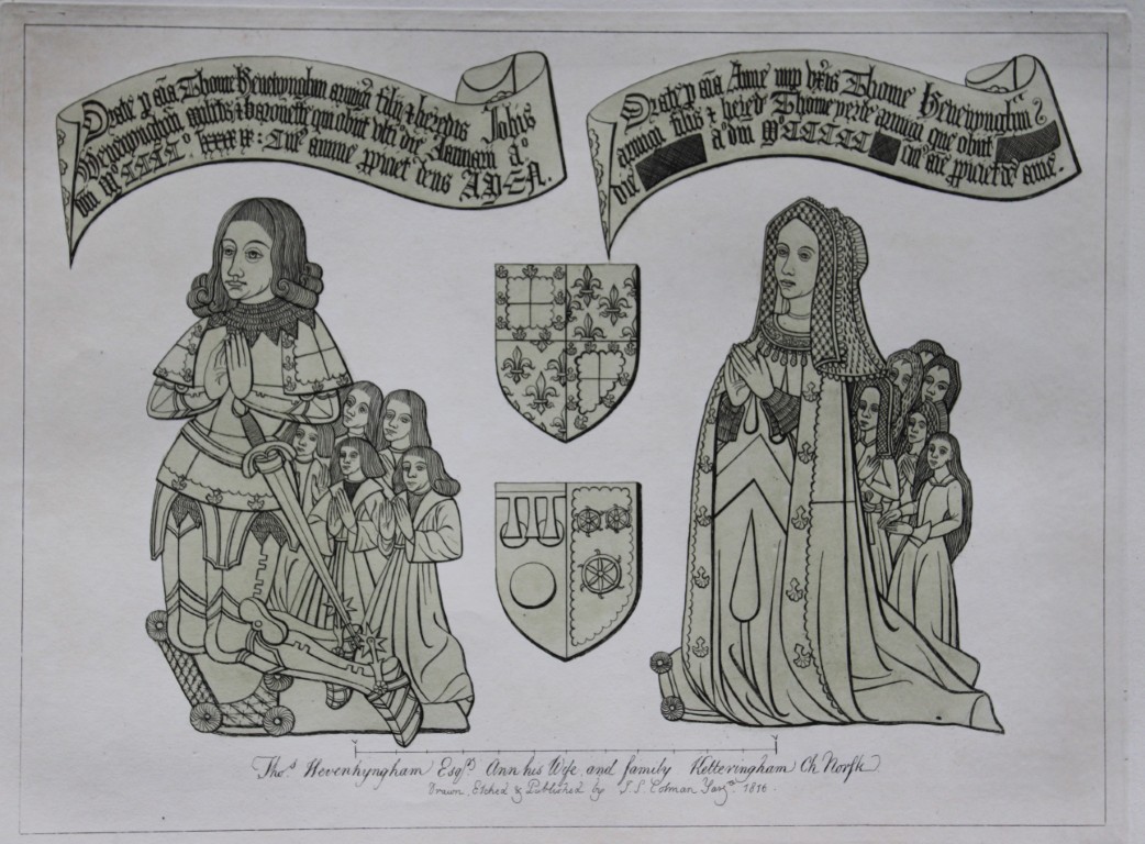 This original 204-year-old etching at Ketteringham Church, Norfolk is from the first edition of Engravings of Sepulchral Brasses in Norfolk by John Sell Cotman. Published in Yarmouth by JS Cotman in 1819.