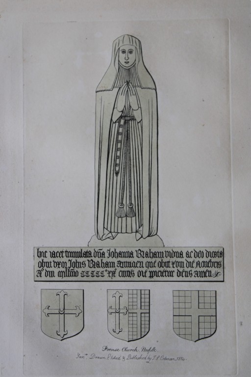 This original 204-year-old etching at Frense Church, Norfolk is from the first edition of Engravings of Sepulchral Brasses in Norfolk by John Sell Cotman. Published in Yarmouth by JS Cotman in 1819.