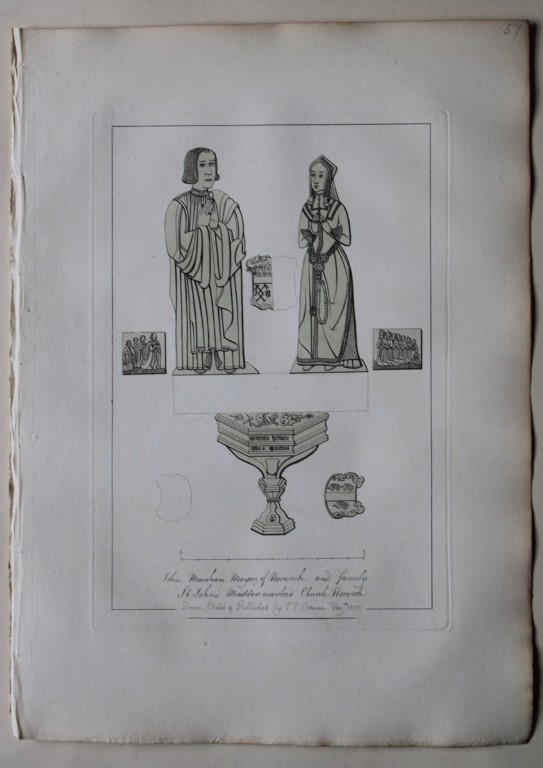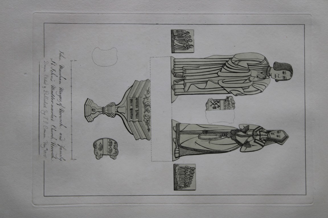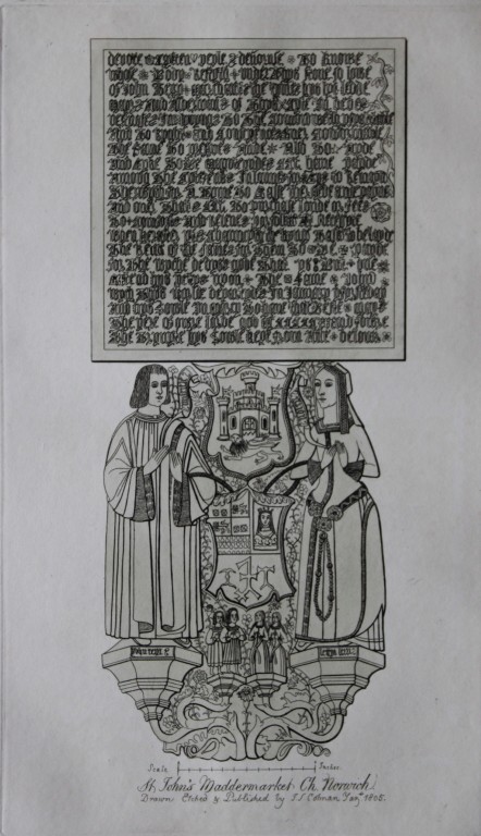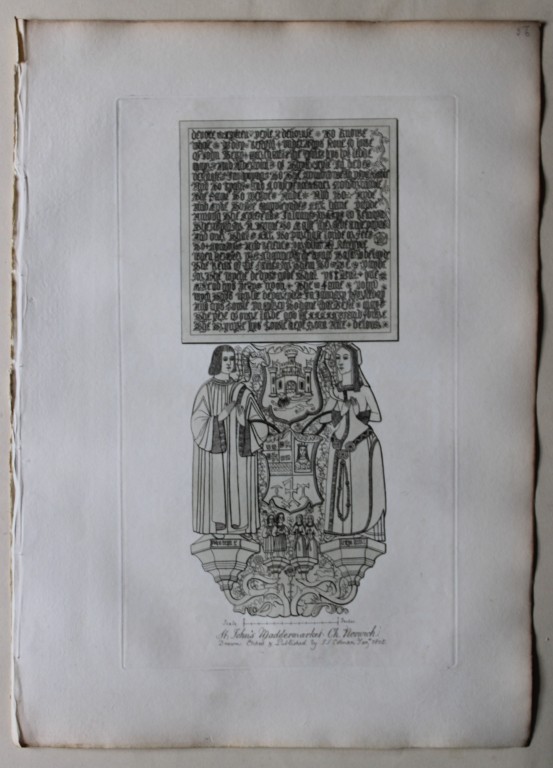This original 204-year-old etching at St. John’s Maddermarket Church, Norfolk is from the first edition of Engravings of Sepulchral Brasses in Norfolk by John Sell Cotman. Published in Yarmouth by JS Cotman in 1819.