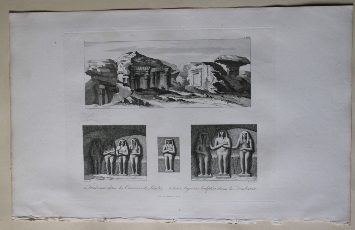 The full details of the composition of this plate are: 1. Tombeaux dans les Carrieres de Silsilis 2-4. Figures Sculptees dans les Tombeaux