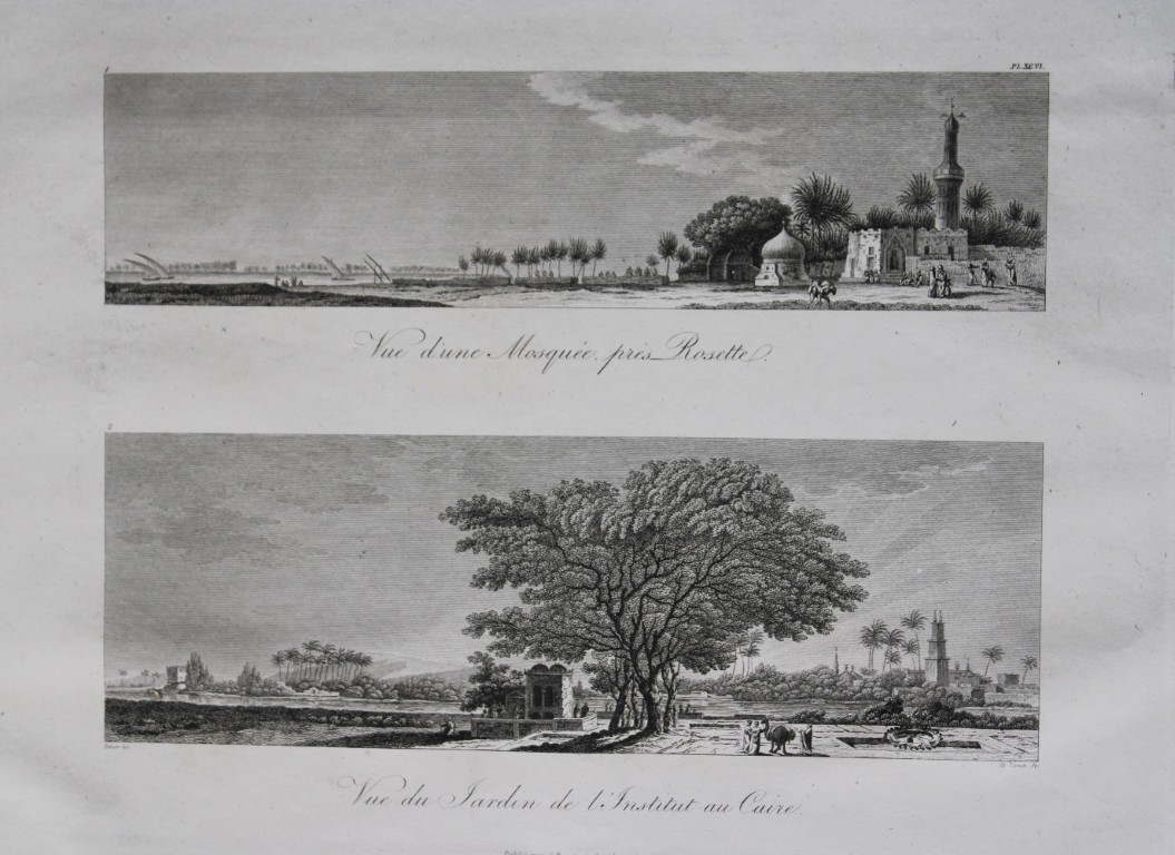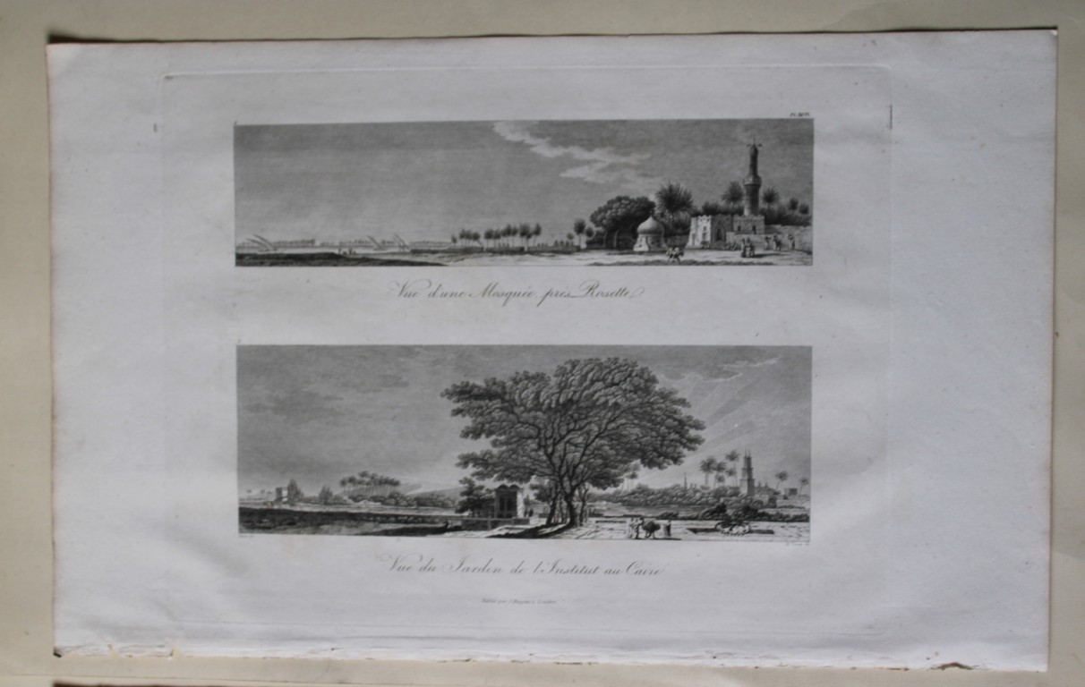 The full details of the composition of this plate are: 1. Vue d’une Mosquee pres Rosette 2. Vue du Jardin de l’Institut au Caire