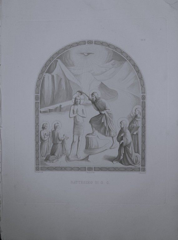 This engraving is from San Marco, Convento dei Padri Predicatori in Firenze, illustrato e inciso principalmente nei dipinti del B. Giovanni Angelico, con la Vita dello stesso pittore, e un sunto storico del Convento medesimo. Del P Vincenzo Marchese. Published by La Societa Artistica, Florence 1853.