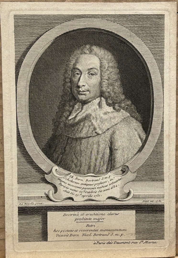 The portrait is of Th. Bern Bertrand , who died in 1782 and is described as a professor of ancient schools .