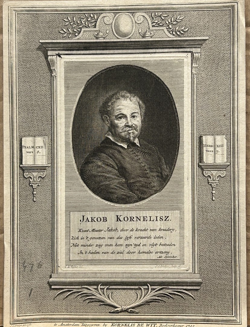 The image features a portrait of the Dutch painter Jakob Kornelisz engraved by Cornelis Visscher and drawn by Jan Caspar Philips. The engraving was published in Amsterdam in 1743 by the bookseller Kornelis de Wit.The portrait is flanked by texts referencing sacred texts (Psalm 112:6 and Hebrews 13:7).