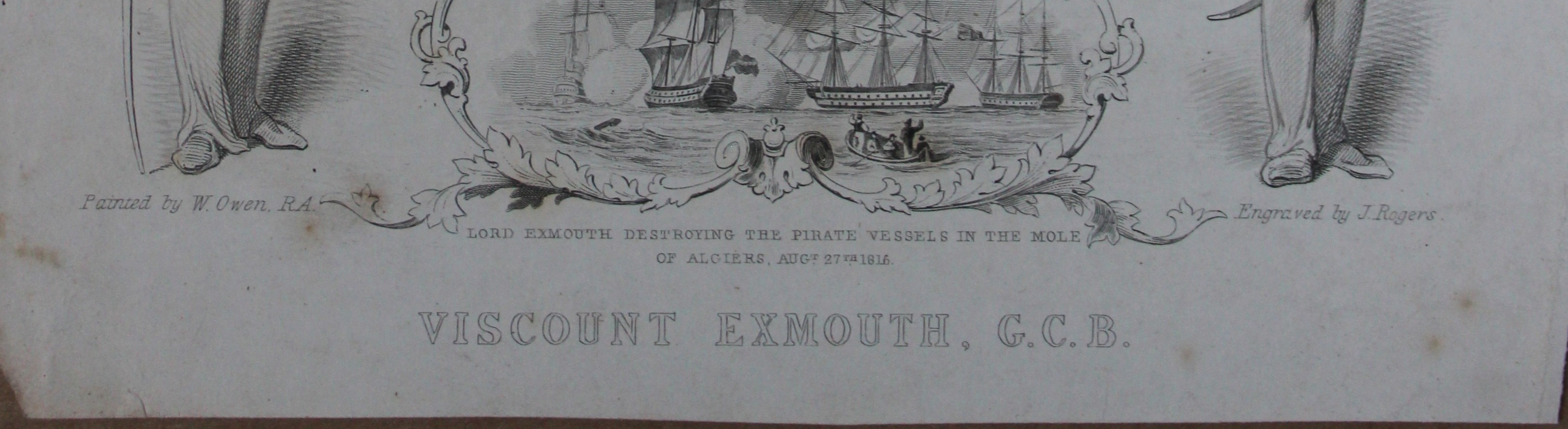Below the portrait, there is a view of Pellew’s bombardment of Algiers in August 1816 with a scrolling border and flanked by two sailors.