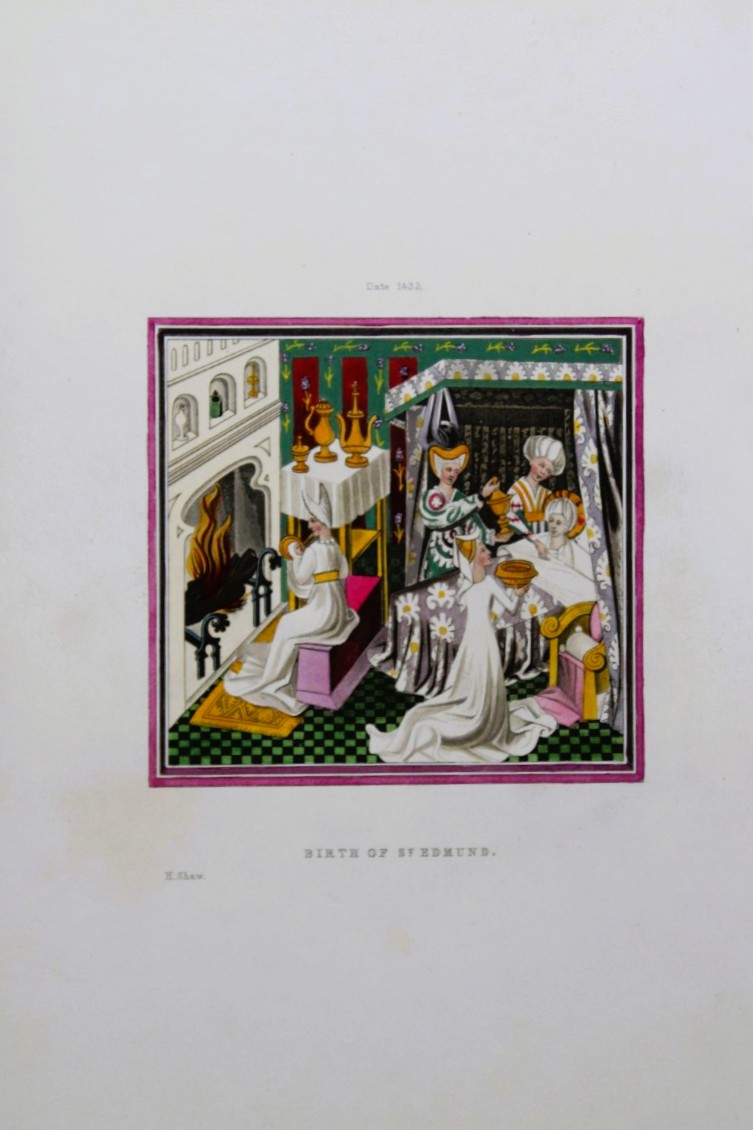 Lot 13178: Henry Shaw - Hand-coloured engraving of Birth of St. Edmund 1858