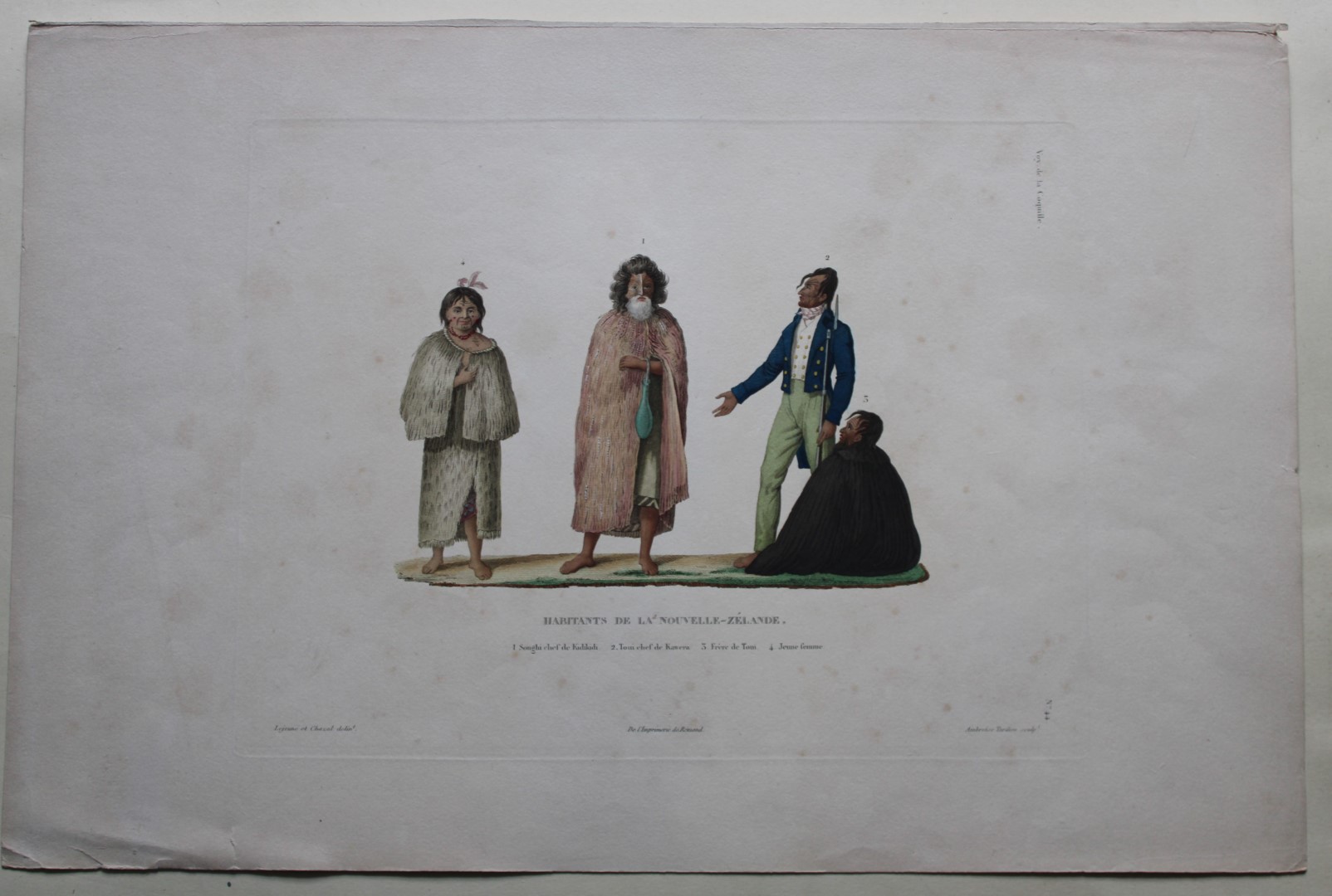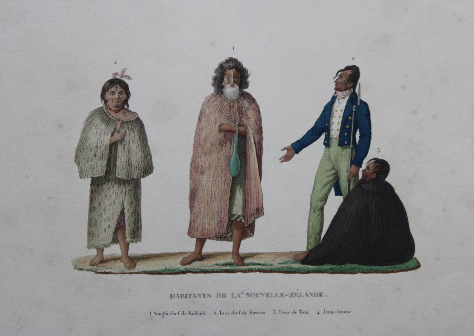 This hand-coloured engraving of Habitants de la Nouvelle Zelande. 1. Songhi chef de Kidikidi. 2. Toui chef de Kawera. 3. Frere de Toui. 4. Jeune femme. is from Voyage autour du monde, exécuté par ordre du Roi, sur la corvette de Sa Majesté, la Coquille, pendant les années 1822, 1823, 1824 et 1825….. by Louis-Isidore Duperrey, published by Arthus Bertrand, Paris 1826.