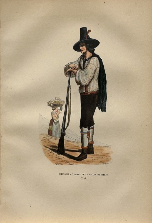 Lot 13512: A Wahlen - Woodcut engraving of Hunter and woman from Zeller Valley 1843