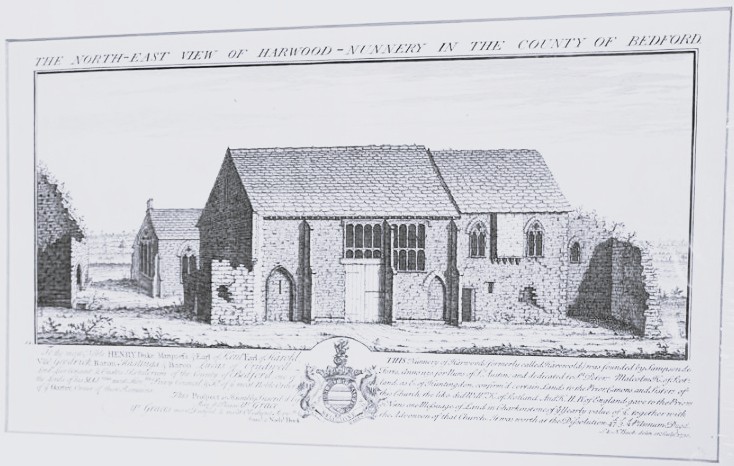 Copper plate engraving of The North-East View of Harwood-Nunnery, in the County of Bedford. by Samuel & Nathanial Buck published 1730.