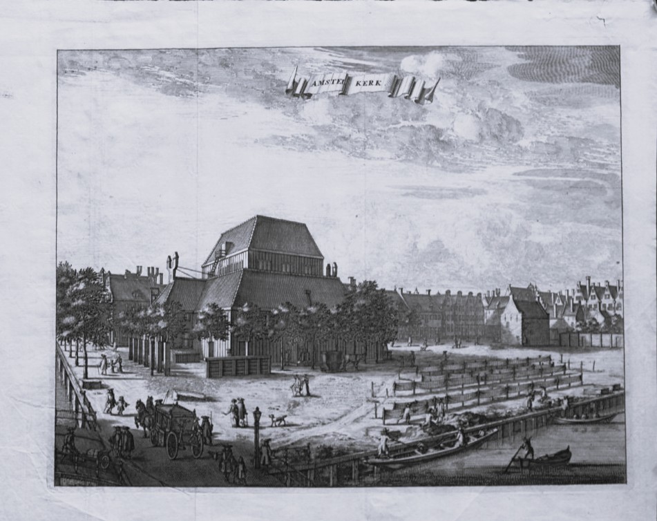 This engraving on hand laid paper is of Amstel Kerk – (Amstel Church) in Amsterdam and is from the first edition of Beschryvinge van Amsterdam by Casparus Commelin. 1693