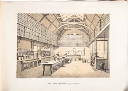 This lithograph is from the Drawings and Plans of the Lawes Testimonial Laboratory, Rothamsted, Herts, F. Dangerfield, 1863.