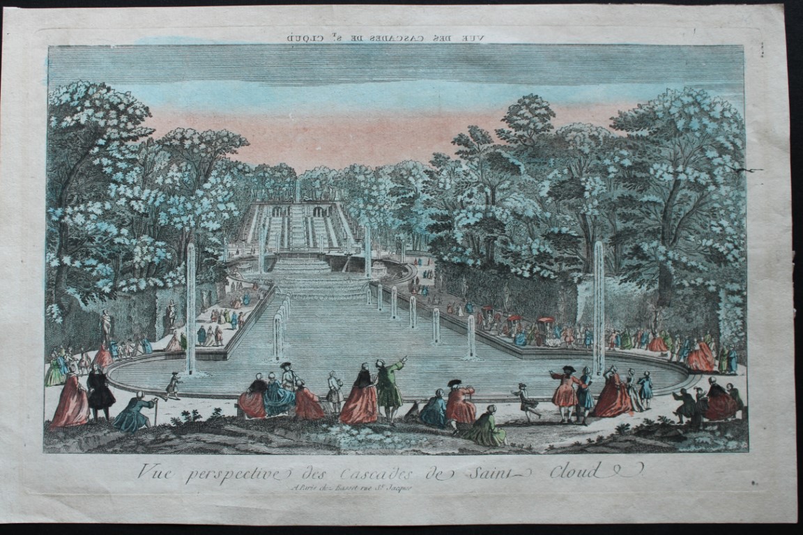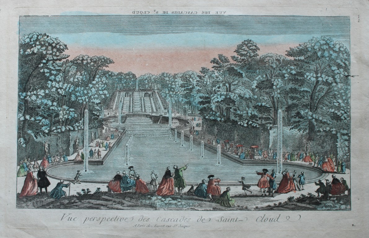 This original hand-coloured engraving is the Vue Perspective des Cascades de Saint Cloud. Published by Paul-Andre Basset, Paris c1780.
