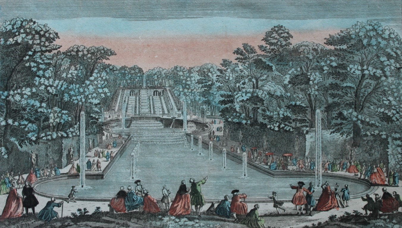 This engraving illustrates the formal French garden and spectacular fountains at Saint Cloud. The principal fountain, the Grand Cascade, measuring 90 meters, was a testament to the mastery of waterworks of architect Antoine Le Pautre.